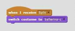 Estos dos scripts transmiten el mensaje de "Split". Un script para el sprite de bailarina simplemente cambia el traje del actual traje el traje de "bailarina-c". (Haga clic en la última foto de este paso.)
