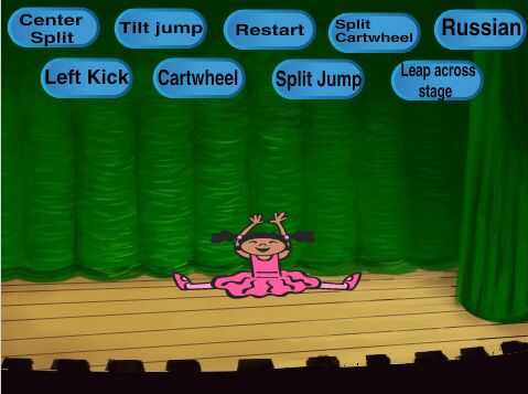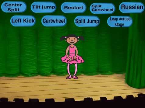 Cada proyecto de Scratch comienza con elegir un fondo y el "vestuario" de los sprites. Un "disfraz" no es ropa, es lo que parece el sprite. Para este proyecto, los trajes son el bailarín en distintas posiciones. Afortunadamente, la biblioteca Scratch proporciona un conjunto básico de bailarines en algunas posiciones. Copiar algunos de ellos y modificado para hacer todas las posiciones que necesitábamos. Usted puede elegir cualquier conjunto de disfraces que desee, o dibuja su propio, o, si eres una bailarina, puede tener un amigo tomar fotos de usted en diferentes poses e impórtelos en cero.