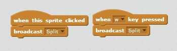 Después de tener al menos algunos de los disfraces que desea usar, puede empezar a escribir guiones para el sprite de bailarina y los sprites de botón. Aquí es un ejemplo de un script para sprite botón llamado "Split". Simplemente responde a esas dos acciones - aunque una de las acciones ("Pulse el botón W") puede conseguirse mediante el teclado, o un grifo del cojín hiciste anteriormente en este Instructable. (Véase los breve dos scripts en la parte superior de este paso.)