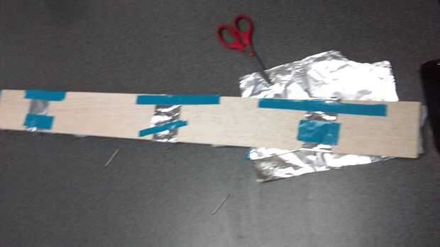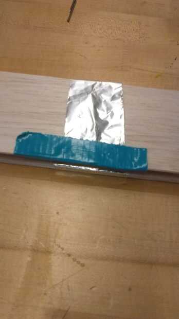 A continuación puede conseguir papel de aluminio y pone papel de estaño en los espacios entre la espuma y la cinta en lugar. Asegúrese de que añadir esto en ambas piezas de madera.