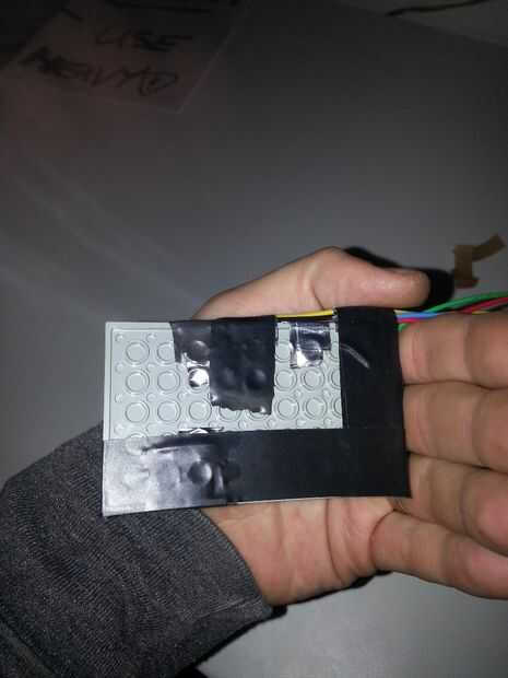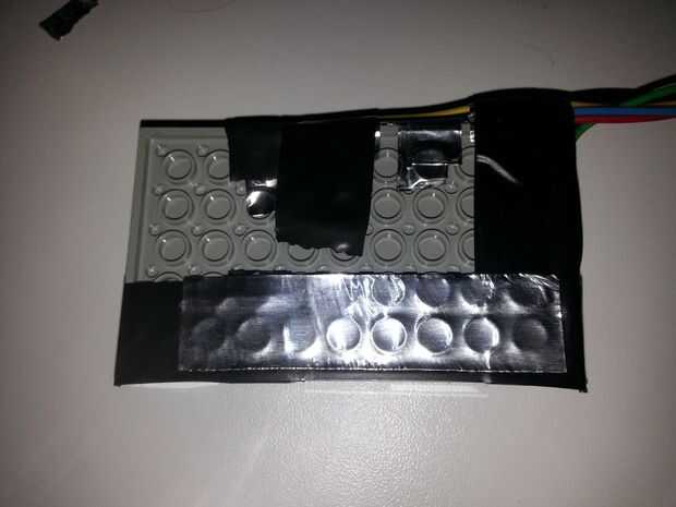 Por supuesto hay que añadir una conexión a tierra para completar el circuito, y que vamos a hacer esto mediante la adición de alguna cinta aislante a la parte posterior de nuestro controlador de lego. A continuación nos añadiremos nuestra tira de cinta de aluminio 7cm o así será suficiente para nuestros propósitos sobre la cinta aislante.