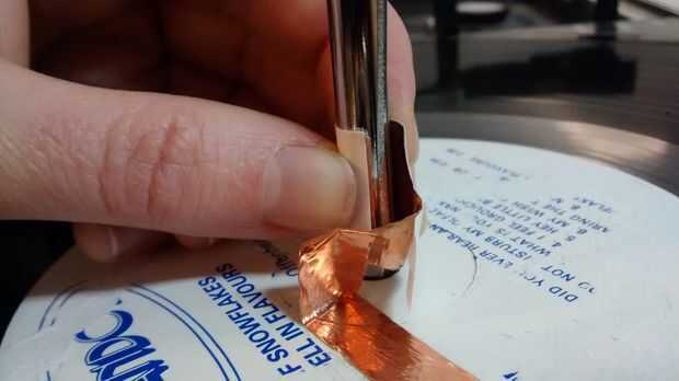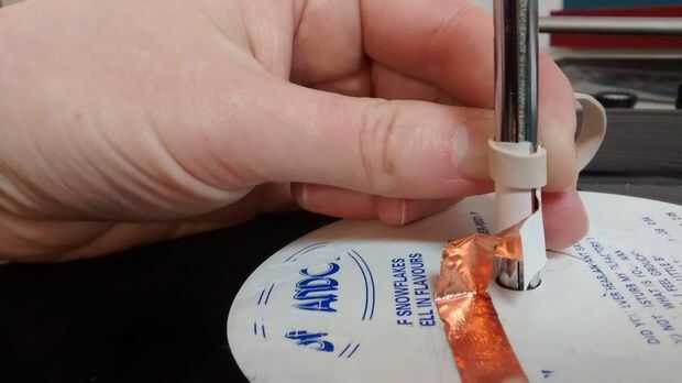 En este paso, creará un rotación contacto eléctrico entre el poste central de los tocadiscos y el registro. Envuelva la cinta de cobre alrededor del poste central con el lado cobre en como se muestra en la primera foto. Luego Envuelva un elástico alrededor de él para que el cobre en contacto con el post, pero no tan fuertemente lo impide el registro de giro. Por último, retire el papel de la sección estrecha de la cinta y empezar a dar el laberinto.