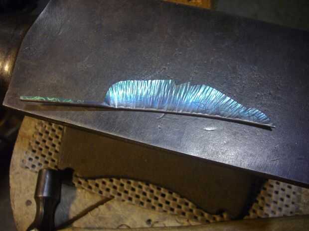Con el doblado de metal sobre el yunque, textura el lado con las marcas que hacen dos cosas. Uno es darle textura. El segundo es estirar el metal en el borde exterior de la forma de la hoja, que se encrespa de la hoja. Esto agrega vida a la pieza. El metal es luego recocido con un soplete de butano para ablandar el metal antes de palanca abierta.