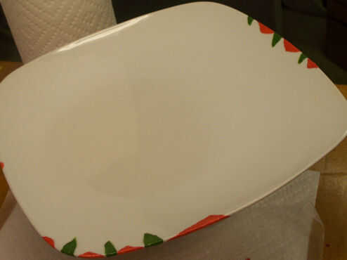 1. Coloque la placa en la parte superior del recipiente. Tenga cuidado de no colocar el recipiente sobre la pintura húmeda. Ahora puede ver cómo los pétalos y las hojas vienen ligeramente sobre los bordes de la placa.