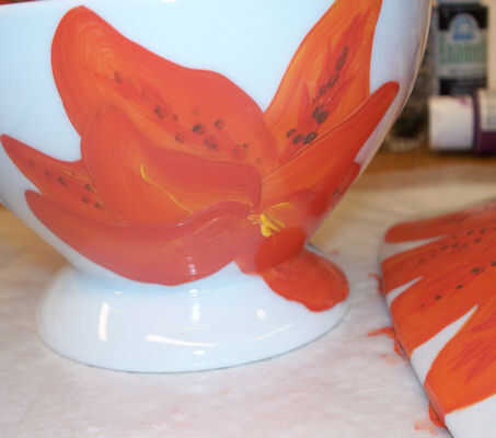 1. volver a la taza. Esta vez agregará un lirio de tigre parcialmente abierta. Esta flor será contenida en el recipiente, no fluye a la parte posterior de la placa.