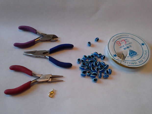 1. granos - usé perlas de 7mm azul mal de ojo. Usé 14 abalorios para la pulsera en este tutorial 2. hilo - utilicé alambre de cobre plateado oro en este tutorial 3. corchete de la garra langosta - para que coincida con el cable de color que utilizas 4. alicates de joyería 5. tenazas 6. salto anillo