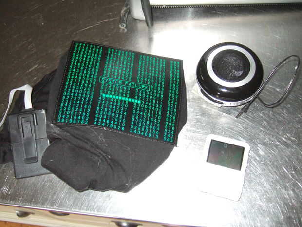 Hemos cargado algunas canciones de robot en el iPod, a baterías en todos los compartimientos, y nuestro hijo puso en algunas sudaderas gris y el robot zapatos. Una vez que todo lo demás estaba en, el panel de luz bailó con la música y cualquier sonido que hace alrededor de él. las luces blinky, gira la polea y la placa de circuito brillaba un hermoso patrón verde.