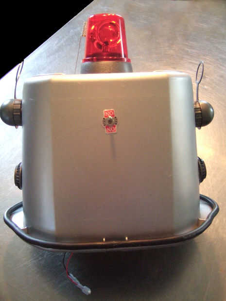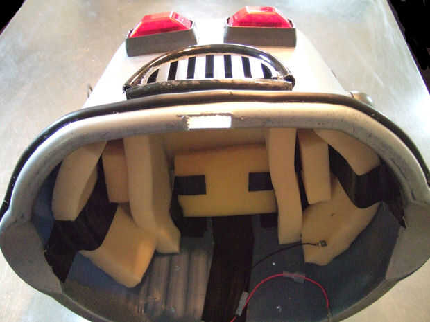 Determinamos donde todo debe ir en el casco. Nuestro hijo se busca a través de la boca, así que tuvimos que colocar los componentes con eso en mente. Hemos grabado en hojas de espuma alrededor en el interior de la canastilla, excepto la parte delantera. Corte un poco menos de la mitad de la rejilla y cortar un agujero en el cubo que la ventila firmemente. La parte plana de la rejilla es por darle el robot un ceño. Aerosol pintado el cubo, sin boca, con la pintura de plata más ligera y rocía la ventilación y las piezas laterales con la plata más oscuro. Una vez seco, resbaló la ventilación en el cubo que sacó la mitad de ella. Pegamento caliente mantiene en. Nosotros también caliente habían pegado las piezas laterales y las antenas cosita. Las luces del remolque conectadas y conectadas a una batería. Puesto que la batería sostiene D cuatro baterías, es muy pesado, por lo que la batería fue instalada dentro del cuerpo del traje con los cables de conexión rápida que van desde dentro de la parte posterior del casco. encendido/apagado se instaló en la parte posterior del casco. La luz de emergencia fue unida con Velcro por lo que puede quitarse para cambiar las pilas. Añadimos capas de espuma para hacerla cómoda, mantener la nariz de nuestro hijo golpee la ventilación y mover el cubo con la cabeza.