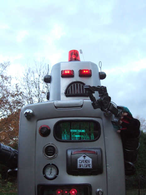 Encontramos muchos de los componentes para hacer este traje con un superávit de almacenar (Axeman en Minneapolis - lugar impresionante). Como hacer un disfraz como este, visitar lugares como Axeman, mercados de pulgas, tiendas de hardware viejo, etcétera, para buscar elementos roboty frescos. Necesitarás un rollo, o tres, cinta gorila, colas que trabajan en plástica, plata pintura de aerosol (hemos utilizado un color más claro y más oscuro para que todo no era exactamente el mismo), de trabajo guantes, gafas y cualquier otro equipo de seguridad necesario para los productos de uso.
