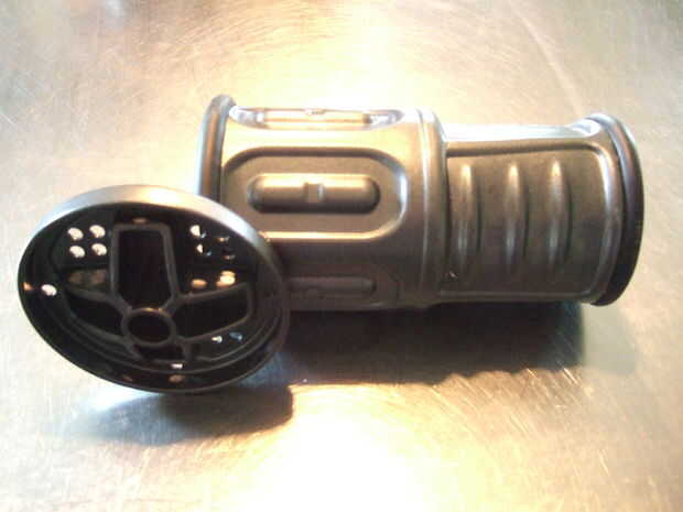 Perfore los orificios para el iPod y el altavoz en un lado del cuerpo y borde con tubería quirúrgica. Usé otra pieza de la cesta de lavavajillas que encaje perfectamente en el iPod. Había grabado en la cesta en el lugar. El iPod se desliza en desde abajo, y he hecho una bisagra de cinta gorila para ayudar a mantener en su lugar. El orador fue grabado en su lugar, el agujero hecho un poco más pequeño que el orador.