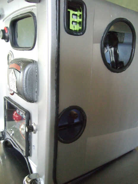 Ahora la diversión parte! Pensamos que todo iba a ir y localizar componentes en el cuerpo con un lápiz. Caliente pegué las perillas de la estufa al cuerpo. Perfore los orificios para los medidores, se deslizó y había jodido en. Los indicadores no están vinculados a nada, por lo que fueron llevados aparte anterior y las agujas fueron fijadas para ver como están funcionando. El compartimento para los ojos fue atado en el interior del cuerpo hacia la parte superior de la espalda. Los cables de liberación rápida se dejaron tiempo suficiente para conectar el casco y permitir que la cabeza a moverse de lado a lado.
