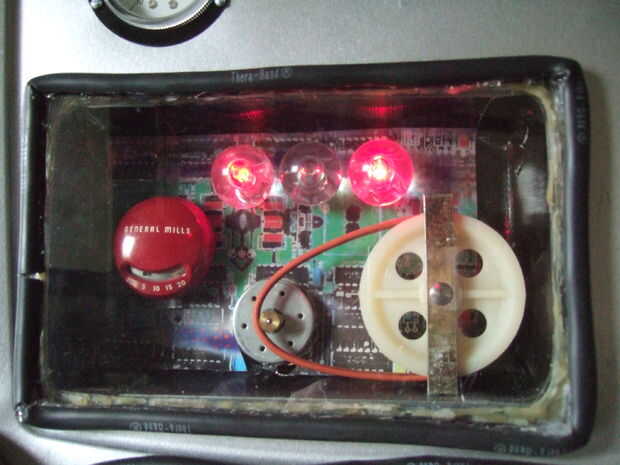 Para las sustancia-obras, he utilizado la parte superior de una cesta de lavavajillas (que era ideal - una caja rectangular poco profundo hecho de rejillas de plástico). Había forrado el interior con papel de vinilo pegajoso atrás lenticular. Los agujeros fueron cortados justo lo suficientemente grandes como para el back-ends del calibre y tres luces llavero blinky. Los artículos se impulsó y asegurados en el exterior de la canasta. El pequeño motor, la polea y la junta tórica se montaron en el interior de la cesta. Está conectado a un pull-down interruptor montado en un lado exterior del cuerpo y está a cargo de baterías montadas en un lugar abierto en el interior del cuerpo. Cuando el interruptor se produce, la polea gira. Se encienden las luces blinky por botones en los extremos que se pegan a través de la cesta. Hice una pequeña jaula de otra pieza de la cesta de lavavajillas y atado a ir alrededor de los extremos posteriores de las luces blinky, para impedir que se enciende y apaga por el vientre de la persona. Cortar un trozo de Plexi un poco más grande que la canasta de sustancia obras y luego la grabó a la canasta. Corte un agujero ligeramente inferior a la canasta y bordes con tubería quirúrgica. La cesta fue luego grabada en su lugar con el Plexi contra el agujero en el cuerpo.