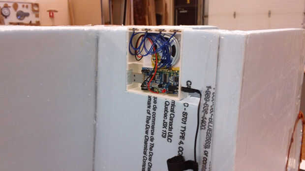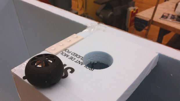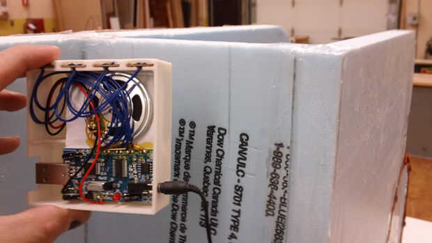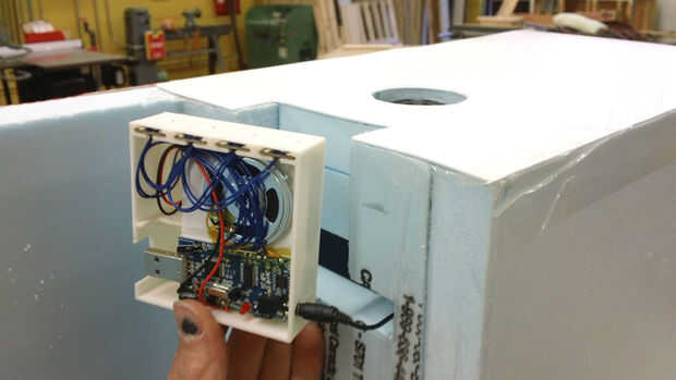• Corte las secciones en la parte de la espuma del sofá para montar el módulo y el altavoz, asegurándose de permitir el acceso para que puedo convertir el altavoz encendido y apagado. También necesitaba la capacidad de extraer el módulo si es necesario cambiar las baterías y carga de sonidos.