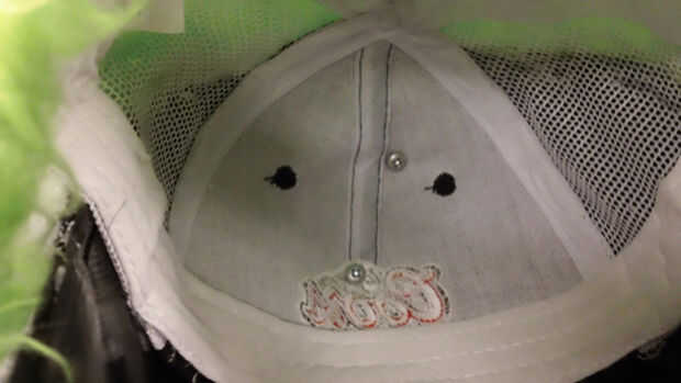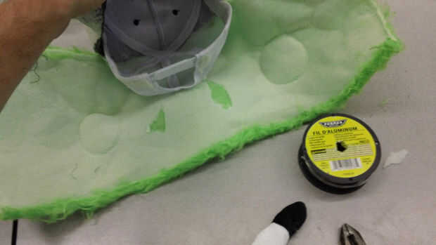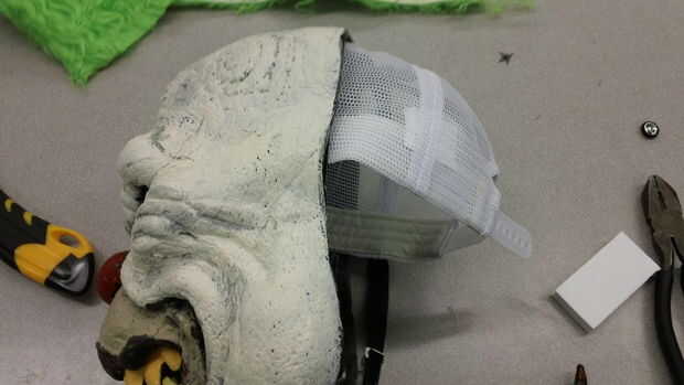 • Usé una vieja gorra para ampliar la parte de atrás de la máscara y que me diera algo para sujetar el cabello. Pegué un alambre dentro de las piezas de pelo que podía manipular la forma y dirección del cabello una vez que todo estaba pegado en su lugar.