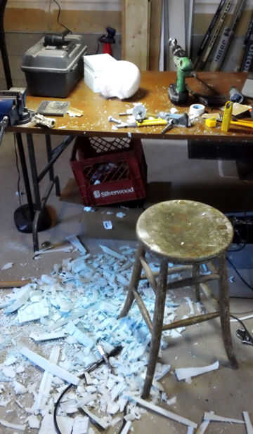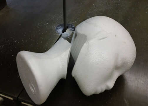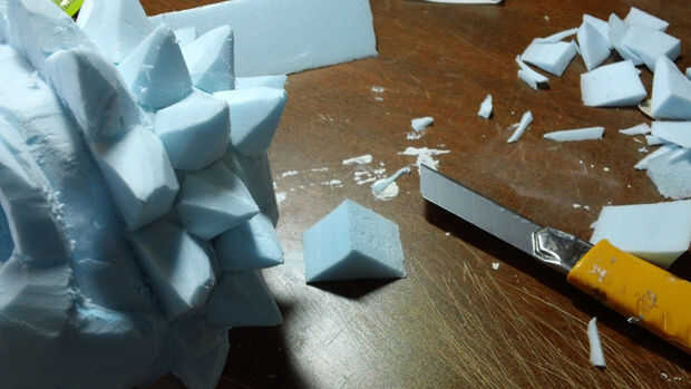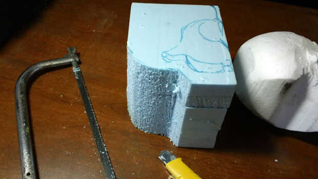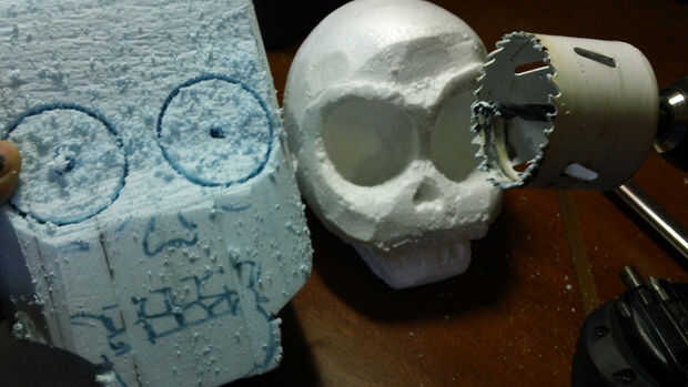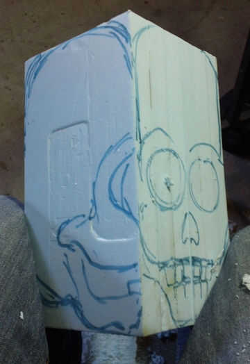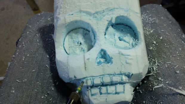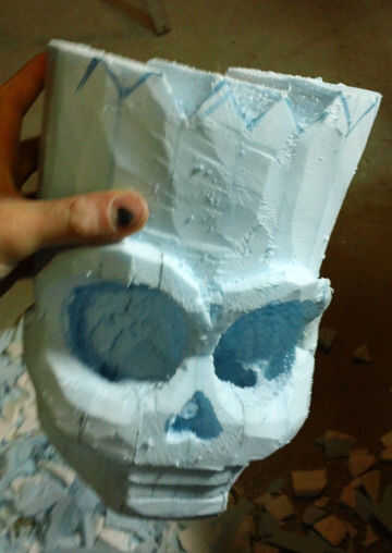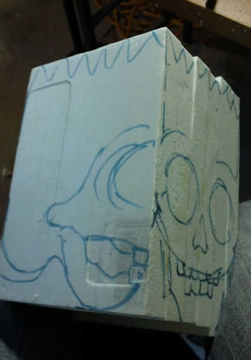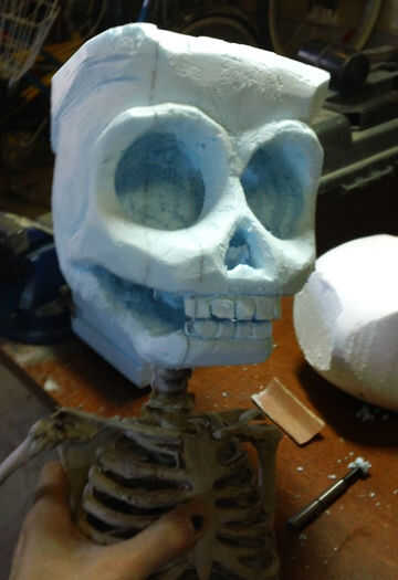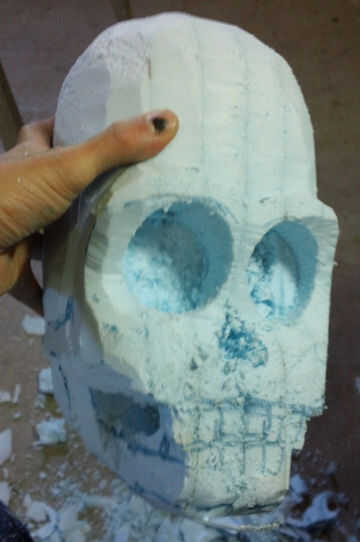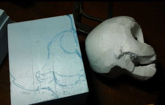 - Comencé por aproximar el tamaño que necesitaría para cada esqueleto. Luego corte y había laminado de piezas de espuma azul utilizando adhesivo en aerosol. Sujeta estos durante la noche para conseguir una buena adherencia. Asegúrese de comprar un pegamento de aerosol de buena calidad. Yo usaba a Elmers que parece hacer el trabajo. Talló el primer cráneo de una cabeza de espuma. No recomiendo esto a todos. Terminé usando este cráneo para Lisa, pero no fue divertido trabajar con. La espuma blanca no es lo suficientemente densa.