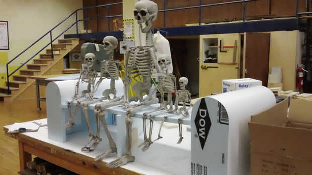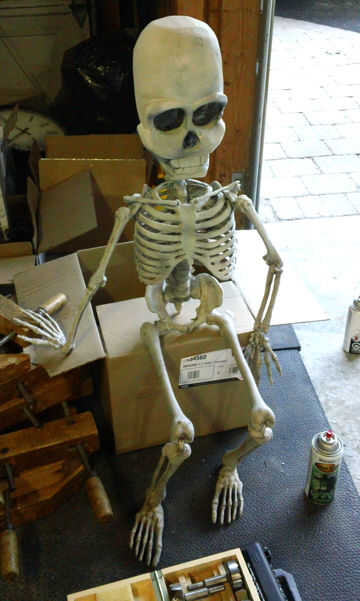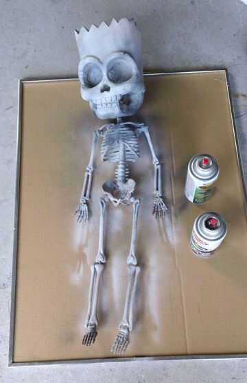 - A continuación adjunto mi cráneos al esqueleto y utilizan una pintura en aerosol color beige claro y alguna pintura en aerosol negro para mezclar el cráneo con los huesos de plástico.