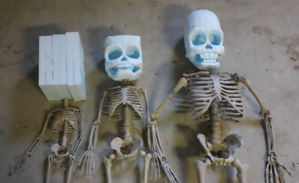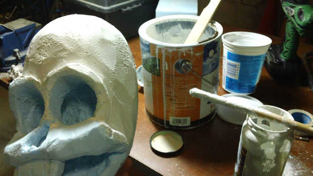- Para proteger la espuma azul de la pintura de aerosol, es necesario untar con algo. Hay varias opciones para esto. Opté por mezclar yeso compuesto mitad y mitad con imprimación de látex. He pintado 3 manos en cada cráneo con un arena claro entre capas.