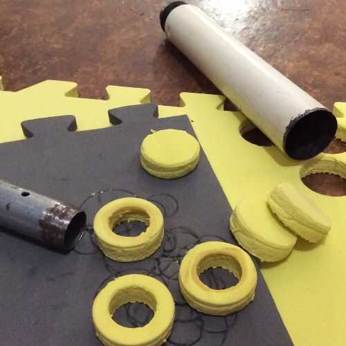 El material de mat de piso de goma es resistente, durable y ligero. Se puede cortar con tijeras. Para el corte de agujeros circulares redondos afilar el extremo de piezas de tubería metálica. Girando y empujando, cortan fácilmente aseados círculos del material de alfombra de piso.