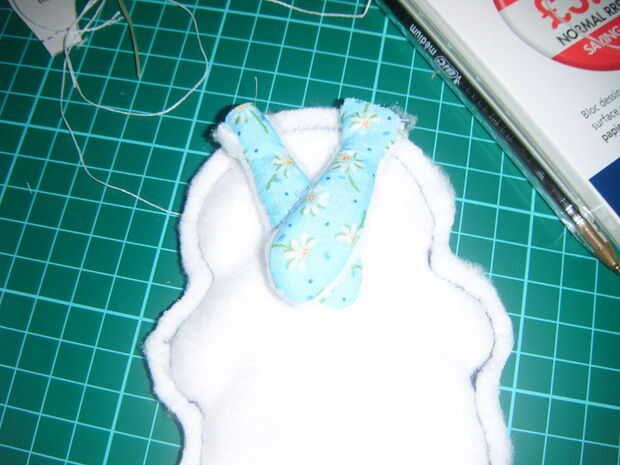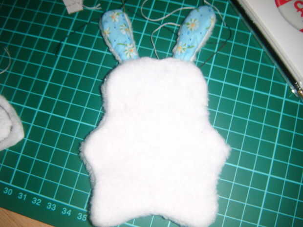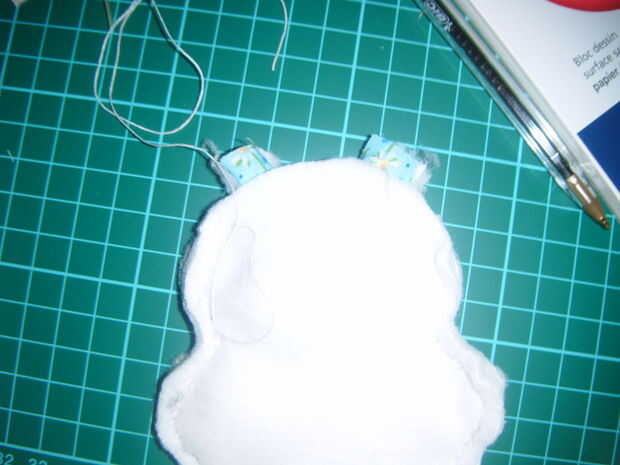 Usando entonces detrás otra vez puntada puntada a través de la cabeza de los conejos y el oído para celebrar juntos pero detiene nuevamente un par de puntadas en dirección al centro de la cabeza, sigue dejando un agujero lo suficientemente grande en la parte superior de la cabeza hacer el conejo de adentro hacia afuera. garantizar / nudo el algodón para que cuando ponga el conejo las puntadas no empezar a venir deshecho.