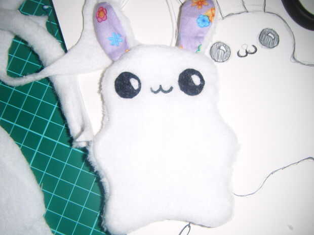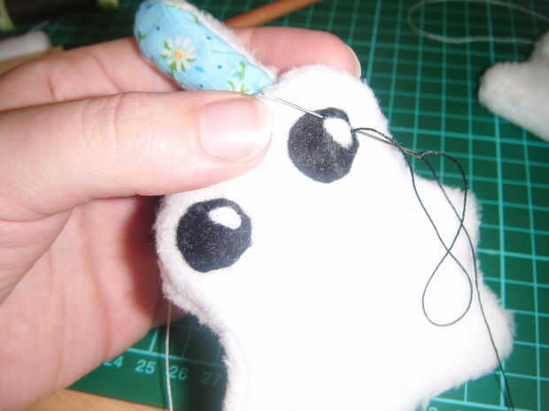 Luego con una fina puntada corriente cosido los ojos en el conejo, que solamente utiliza aprox. ocho puntadas en cada ojo.