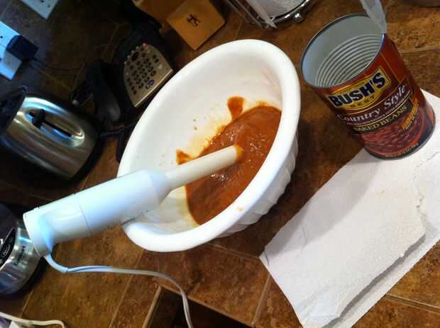 1) mezcla abajo 28 oz de frijoles horneados en una pasta.