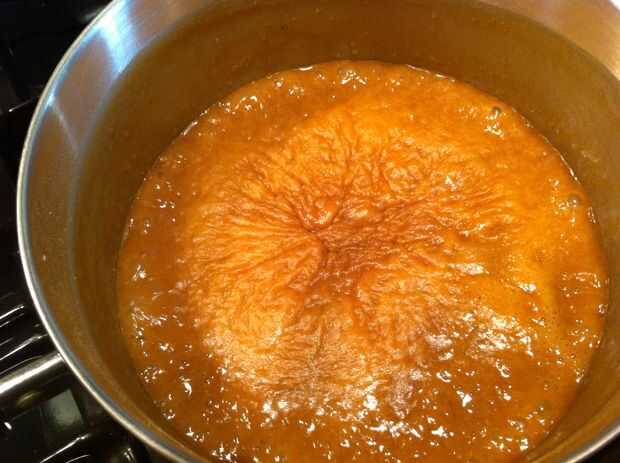 6) llevar la mezcla a ebullición, revolviendo suavemente todo el tiempo (para minimizar el pegado en la parte inferior de la olla)