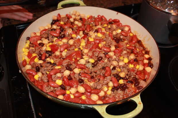 Receta de Chili2 cucharadas aceite2 cebollas medianas, picadas3 cucharadas picada ajo1 libra carne de res molida (prefiero carne molida gruesa para Chile o Chili carne)1 libra de salchicha caliente Jimmy Dean1 lata de tomates en cuadritos (14.5 oz)1