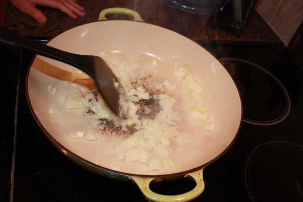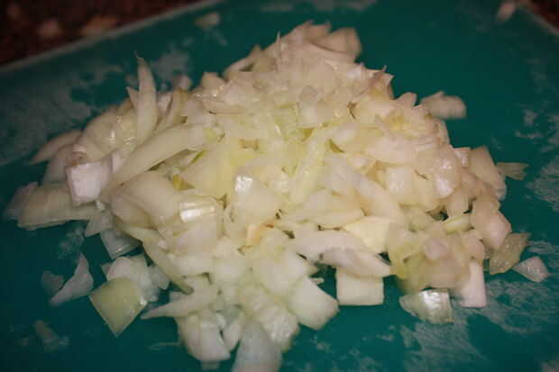 Pele y pique la cebolla. - Consejo: (deje sus ojos tanto como sea posible para reducir el dolor, pero no limpiarlo hasta que lave. Sólo tenga cuidado de no cortarse.) Luego poner una pequeña cantidad de aceite en una cacerola a fuego medio. Saltear las cebollas hasta que estén transparentes, luego quitarlos y guardarlos para más adelante.