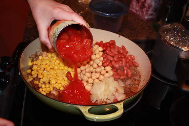 Después de la carne y especias se combinan, añadir las verduras como se indica, luego mezclar todo hasta que el Chile se mezcla uniformemente.