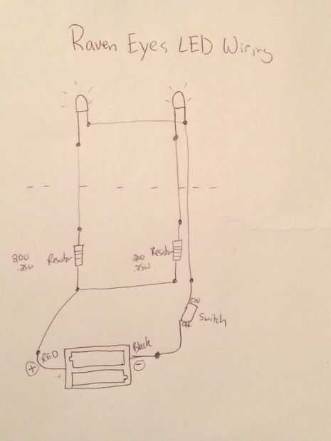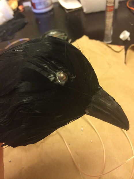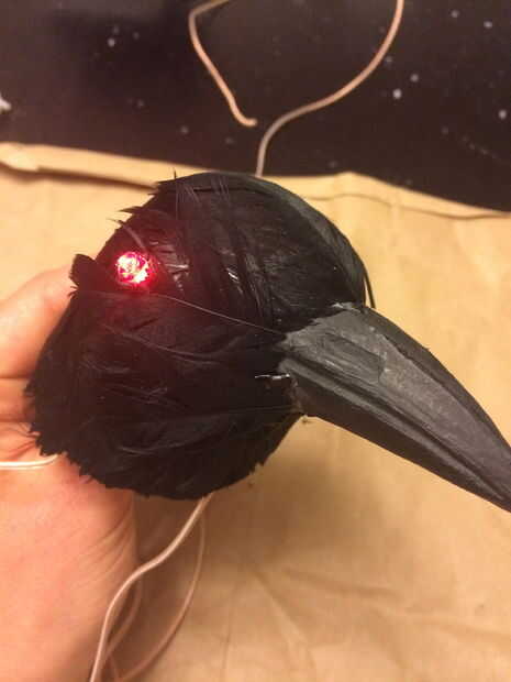El extremo de los cables que están conectados a los extremos largos de los LEDs porque usted querrá asegurarse de que los cables son los que se conectan a la Internacional de resistentes a la marca. Una vez que conecté los cables directamente a los extremos de los LEDs, he pulsado el LED en pequeños agujeros en la cabeza de cuervo. Hice los agujeros pequeños por x pequeño corte con un cuchillo.