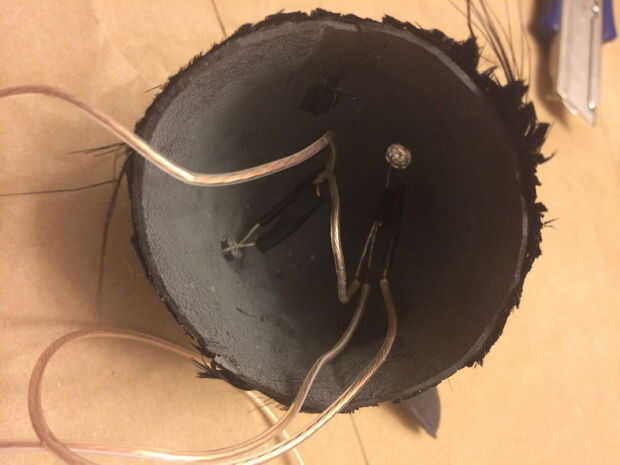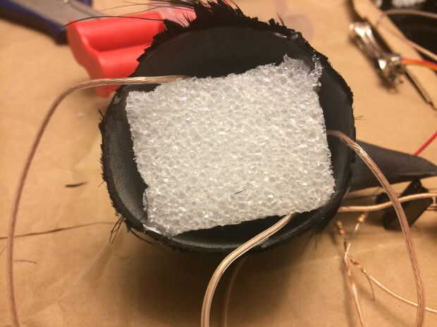 A continuación, corte un pequeño pedazo de espuma de poliestireno y con resina, pegados a la espuma de poliestireno en dejando espacio para los cables a la cabeza de cuervo. Finalmente, terminé el resto del circuito, soldando las resistencias y el resto de los cables a la batería.