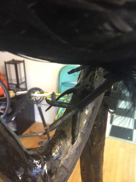 Una vez que el personal estaba totalmente secado, perforé dos agujeros en el rodaje de donde irían los pies del cuervo. Recomiendo encarecidamente conseguir un cuervo con alambres sólidos que salen de sus pies. Usé un poco de epoxy y pegados los cables en los agujeros.
