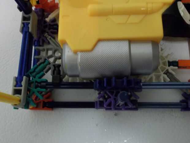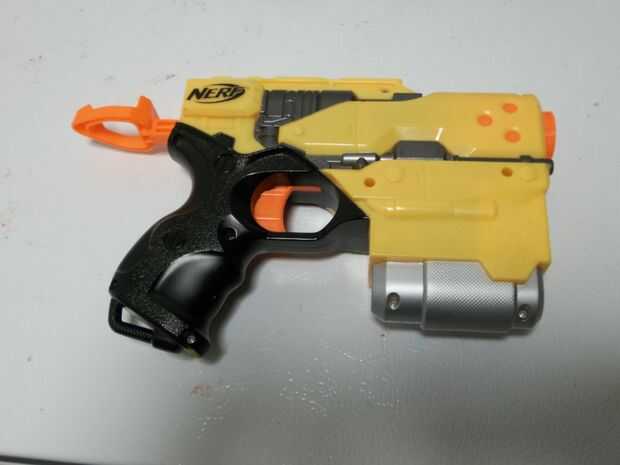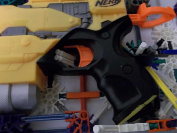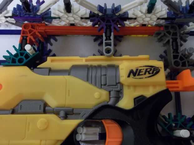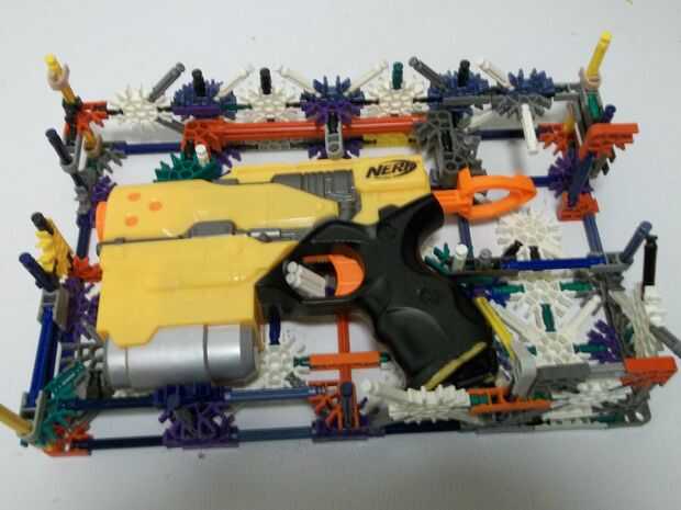 Esta es la parte más importante de la maleta entera. Por favor coloque el arma de Nerf en como se muestra en la imagen. Observe que las barras blancas que están conectadas a los conectores gris en la sección A son a través del protector del disparador y delante del gatillo. Esta cosa entera no funcionará si eso es colocada incorrectamente.