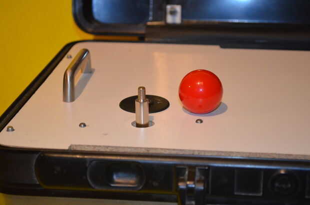En la imagen se observa el joystick de ocho posiciones fijado al laminado, el cubre polvo y la bola de sujeción sobre puestos. Lo colocamos a la izquierda de la maleta porque le dimos preferencia a un teclado pequeño estará colocado a la derecha y es fácil cruzar al extremo de la maleta de control y accionarlo.