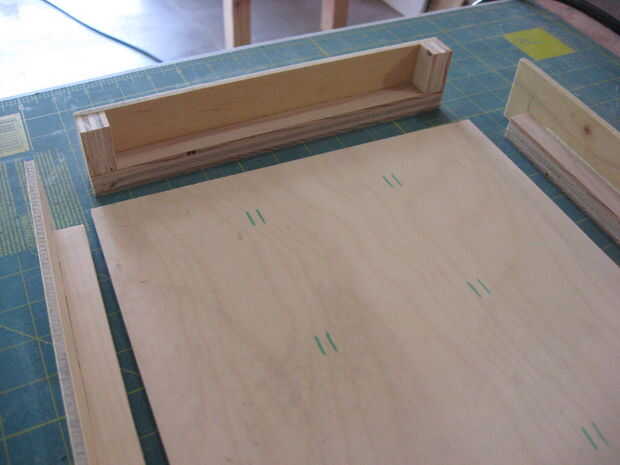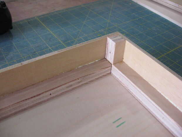 Las tiras de madera contrachapada de 3/4" fueron cortadas a varias longitudes para construir el marco interior en su lugar, conectar todas las piezas de lado. Se aplicó una fina capa de pegamento para madera a las superficies de las piezas que se unen entre sí antes de clavar.