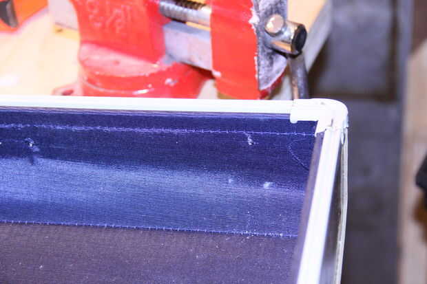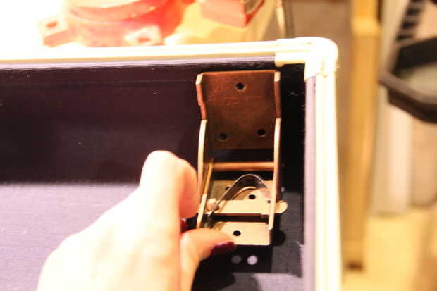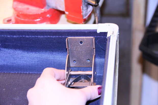 Aquí es donde los problemas con los bordes redondeados de la maleta. Es difícil montar algo más de dos pulgadas al lado de la maleta y que se encuentran al ras porque la curva de los bordes. Acabo de hacer con lo que tenia, por suerte las bisagras no eran demasiado grandes. Colocar las bisagras de la maleta con los tornillos. El marco principal de la maleta se hace de la madera por lo que debe fijar firmemente.