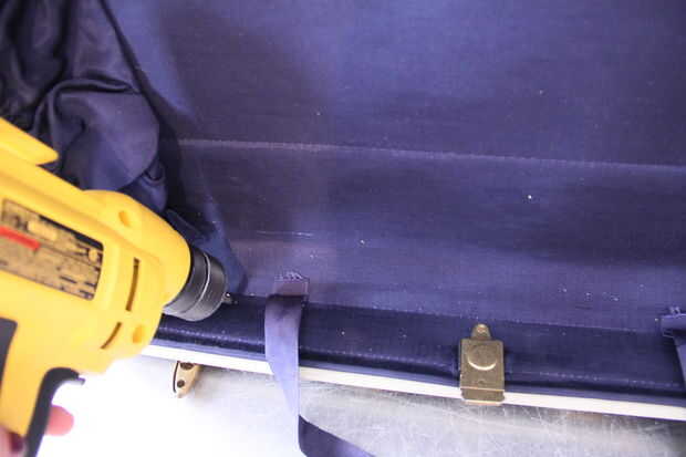 - Línea de bisagra contra el borde de la maleta y marca con tiza donde la bisagra se atornillarán al caso (verás tres agujeros en la bisagra que es donde se marca). Para ello en absoluto para las esquinas de cada pierna.