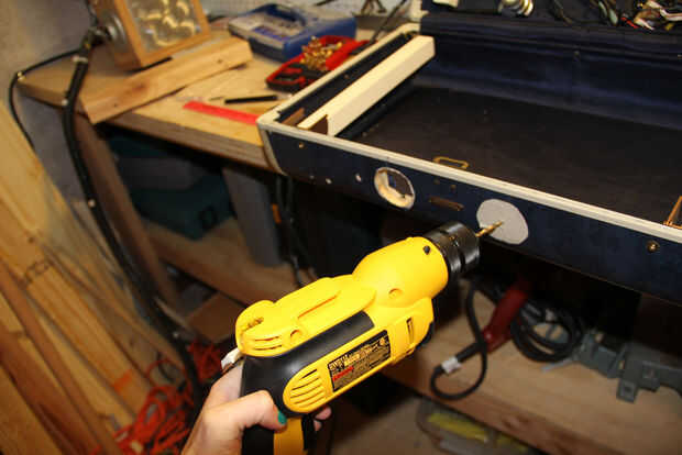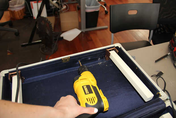 - Taladre un orificio donde van las perillas. Asegúrese de que usted utilice la broca de tamaño correcto: desea que el botón para encajar perfectamente en el agujero. Su ok si el exterior de la maleta se ve feo o rasgado para arriba porque el agujero se cubrirán por los accesorios de pomo de plástico.