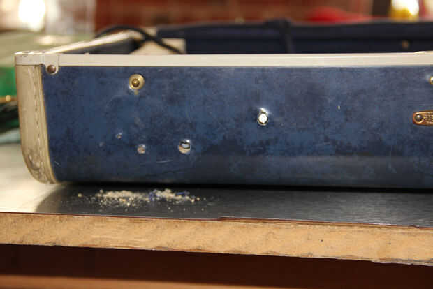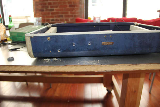 - Use un taladro de mano y perfore un orificio piloto en el centro de la maleta. Subir en tamaños de pedacito de taladro hasta que han perforado el agujero más grande posible.