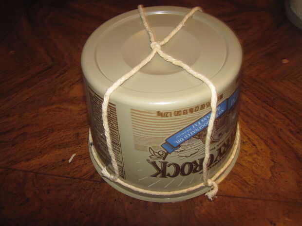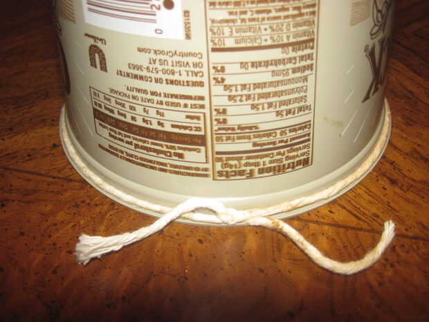 Envuelva la cuerda alrededor, metiendo bajo el labio del borde superior y luego Átala con un nudo simple. No es necesario que sea muy apretado, pero solo para que quede. Luego sáquelo del contenedor así que usted puede Agregar las otras piezas.
