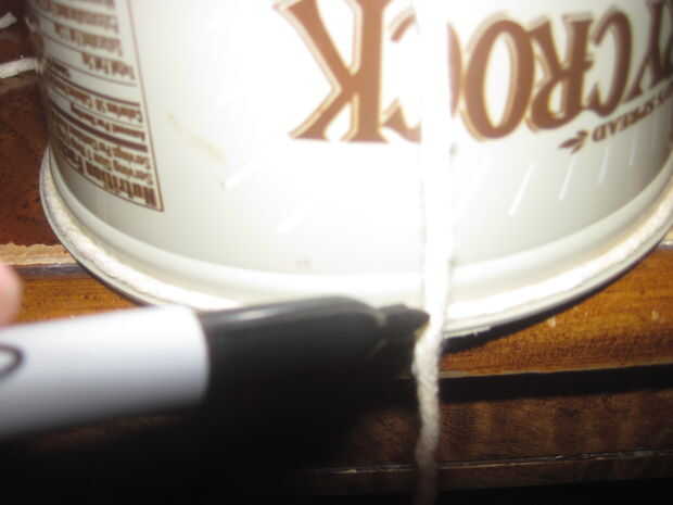 Una vez atado, traiga los extremos sueltos hasta el borde superior de su contenedor en el lado opuesto de donde empezaron. Con su marcador, marque el extremo suelto y el lazo donde se encuentran. Una vez más, no es necesario a ser apretada, pero apenas ceñido.