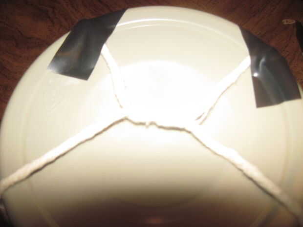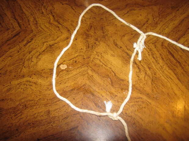 Medida suficiente cuerda para ir desde el labio superior, todo el camino en el contenedor y volver por el otro lado el labio superior, además de 3 o 4 pulgadas y hacer dos piezas de esta longitud.