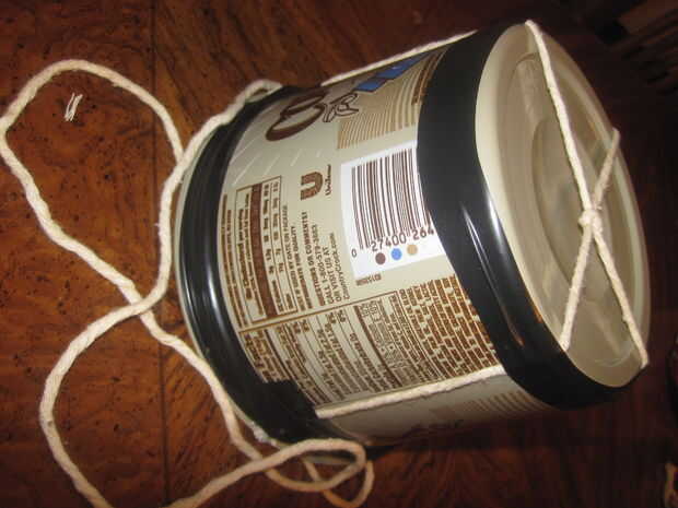 Coloque el envase en el recipiente y ajustar todos los bits hasta que sea la forma que gusta. Puede que deba desatar/retie algunos de los extremos de la cadena para obtener perfecta.
