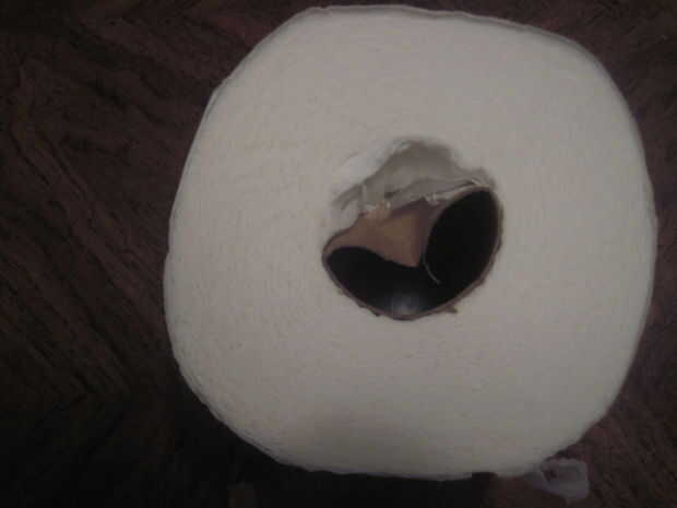 Su rollo de papel higiénico y quitar la base. La forma más fácil es doblar un poco hacia atrás, a continuación, trabajar con los dedos todo el camino alrededor. El papel se pega a la base, por lo que tendrá para rasgarla. Es sólo papel higiénico, así que no será tan difícil, pero no quiero acabar tirando todo el papel que en el proceso.