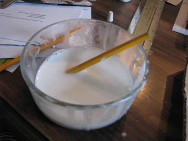 Mezcla una parte de agua a una parte blanco pegamento. Terminé usando la mayor parte de la botella, unas 5 cucharadas.