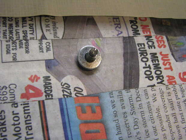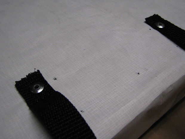 Fuerza un remache limpio en los extremos de las manijas de fleje y luego en los agujeros que hiciste en tu maletín. Los remaches del estallido. Pongo una lavadora pequeña en el interior de cada remache ayudar a evitar que se tire.
