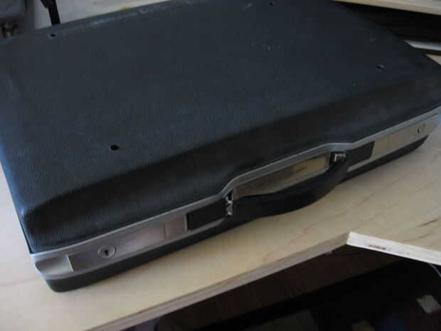 1. maletín (compró minas de buena voluntad por $5.00 y mina fue plástico muy resistente con bisagras de metal grandes)