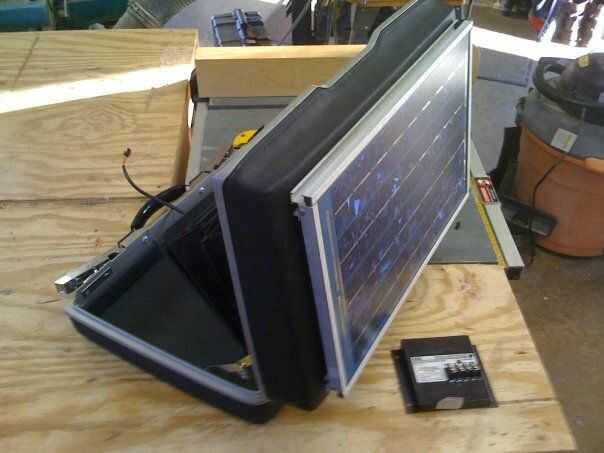 Todo creado con batería, maletín gigante y gran panel solar pesos alrededor de 10 libras por lo que es sorprendente la luz para todo un sistema. No estoy seguro de cuanto tarda en cargar completamente la batería pero estoy seguro de que alguien sería capaz de calcular cuánta energía podría desprender la batería.