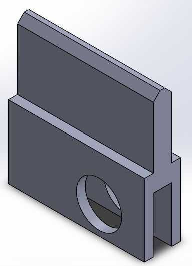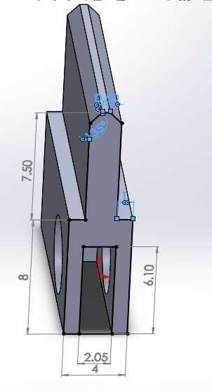 La dimensión del diente es arbitrario y en este caso seleccionado que es de 15 x 4 x 15,5 mm (L x W x H) el diseño del diente es bastante sencillo, básicamente crear un perfil de él, sacar y cortar la ranura y agujero para la varilla del diente (detalle de la barra del diente en un paso posterior)