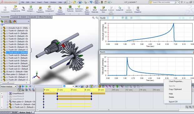 2) esta vez quieres "adhiera" el motor lineal para los dientes y asegúrese de que la placa y el eje no giren (fijar la placa o definir una pareja paralela para los dientes y una cara fija). Siguiente quieres registrar los datos de la velocidad lineal para el cubo y guardar. Hacer esto para apertura y cierre de los dientes difundir ya que ambos son diferentes.